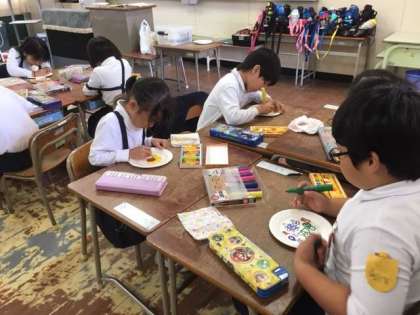 1年生は図工で「皿回し」を作っていました。お皿に好きな絵を描き出来たらお皿を回して楽しく遊ぶことができました。