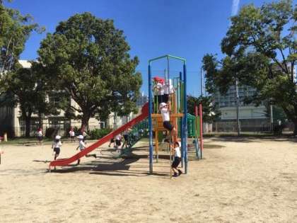 秋空の下で元気に遊ぶことができました。遊具は順番に並び上手に遊ぶことができていました。生活科で使うどんぐり拾いもでき大満足で過ごすことができました。