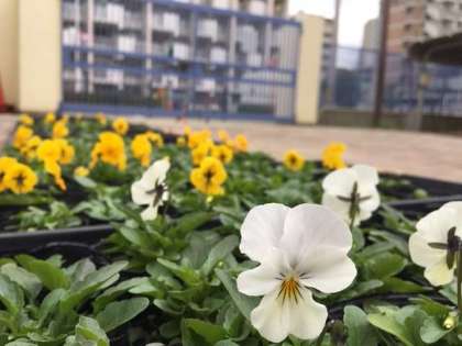 9月に子どもたちが蒔いたビオラもどんどん咲き始めています。