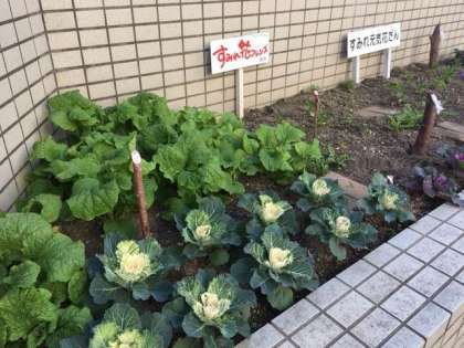 正門の左側の花壇にすみれ花フレンズの皆さんが葉牡丹を植えてくださいました。