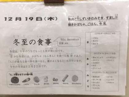 今日の給食は冬至献立で焼きかぼちゃがありました。冬至にはかぼちゃ(なんきん)を食べる風習があります。これは「ん」が重なる食べ物を食べると運がよくなるといわれているからです。また、栄養価の高いかぼちゃを食べることで、風邪を予防することにもつながります。