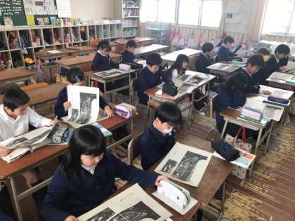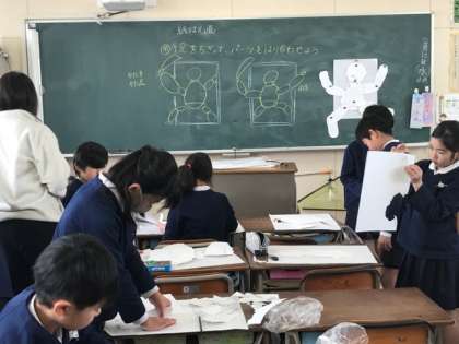 2組は「紙版画」で鬼を作っていました。紙を丁寧にちぎり体のパーツを作り机からはみ出るくらい大きな鬼を作っていました。