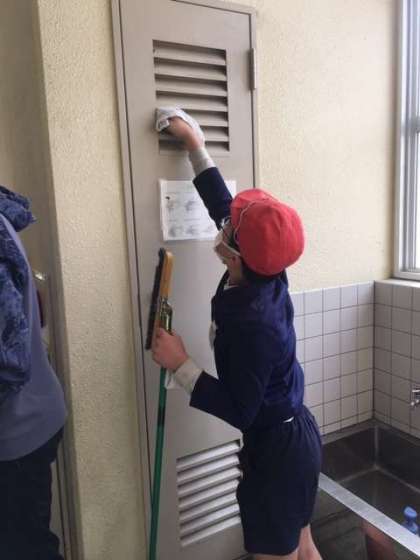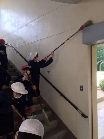 たてわり班で廊下や階段の壁や窓のサッシなど普段あまり掃除しない箇所を中心に掃除をしました。壁の上のほうにはほこりがついていたのでほうきでほこりを落としたり通気口のほこりを取ったりしました。上級生が下級生を教える姿が見られなかよく掃除をすることができました。掃除の様子をたてわり班の担当の先生が採点し紅組と白組で合計点を競いました。