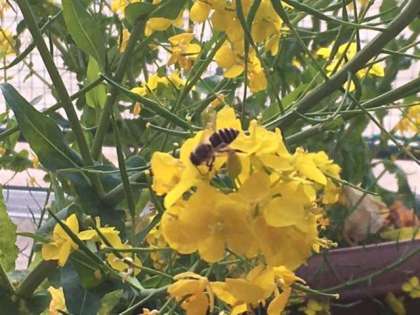 学習園のキャベツには早くもモンシロチョウが卵を産みつけに来ていました。菜の花にはたくさんのミツバチが蜜を集めていました。