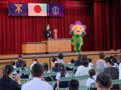 学校長の式辞があり、その時にすみれ小学校のマスコットキャラクター「すみれっち」が登場しました。「すみれっち」から1年生の子どもたちに3つの約束(「帽子をかぶろう」「見守り隊のみなさんにあいさつをしよう」「車や自転車に気をつけて登校しよう」)を守ってほしいとお願いがありました。
