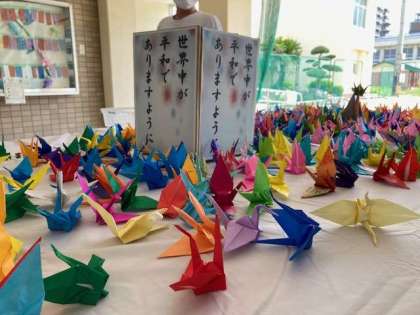 すみれっ子が折った鶴は玄関の机の上に飾られました。玄関ホールの机は平和への願いがのめられた折り鶴でいっぱいになりました。
