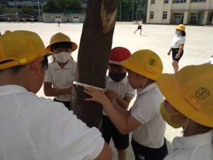 まずは、10メートルの長さを体感し、班で決めた測りたいものを測りました。木の周りや藤棚の周りを図りながら「ものさしじゃ測れなかったね。」とまきじゃくの良さを感じていました。さらに、校門の幅や鉄棒の長さを測りました。