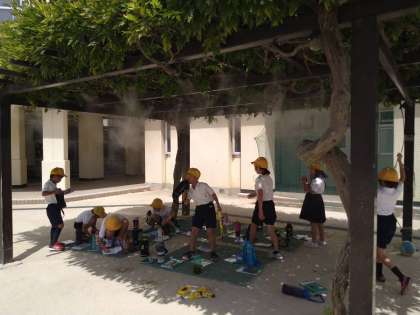 熱中症対策のため、藤棚の下を休憩スポットにし、一つ測るごとに涼みました。