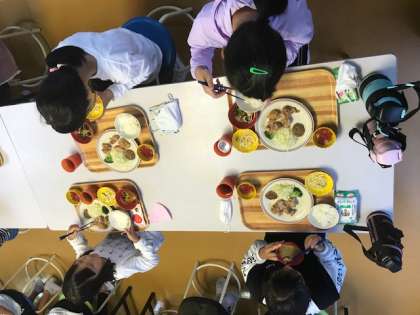 みんなが待ちに待った夕食の時間です。昼間に一生懸命活動したので、とってもおいしそうに食べています。