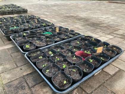 ピートバンからかわいらしいビオラの芽がたくさん出ましたので、いよいよポットに移植する作業がスタートしました。