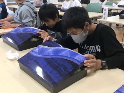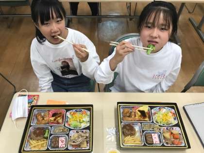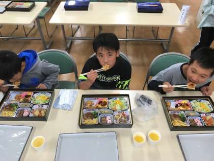 ワクワクしながら夕食の中身をのぞく子どもたちです。