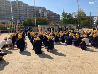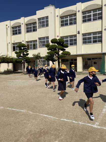 子どもたちは担任の指示をしっかりと聞き、どの子も「お・は・し・も」」(おさない・はしらない・しずかにする・もどらない)の約束をきちんと守り、すばやく運動場に避難することができました。出席児童数567名の人数確認完了まで4分20秒という結果でした。
