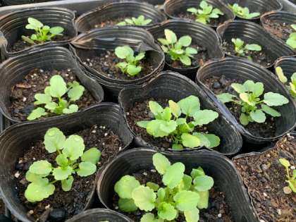 「すみれの種まき」でピートバンにビオラの小さな種を植えました。小さな種から頑張って成長したビオラをポットに移植して、現在は講堂前に並べています。写真のように、葉をたくさんつけて広がり、元気よく成長しています。