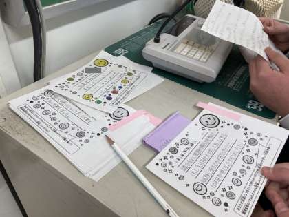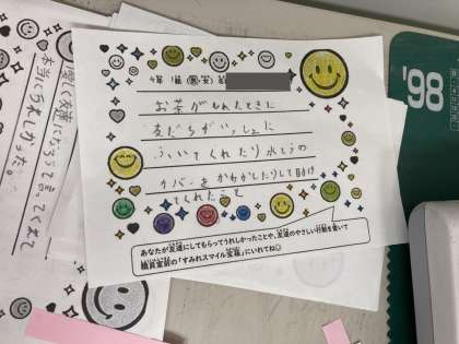 「すみれスマイル宝箱」は、各クラスでいじめについて考える時間を作り、「いじめ0行動宣言」振り返ります。そして、この一年間で友だちにしてもらったことや、友だちがしていた素敵な行動を「スマイルカード」に書き、職員室前に置いてある「すみれスマイル宝箱」に投函する活動です。そして、投函されたものを給食時間中に放送で全体に広めています。