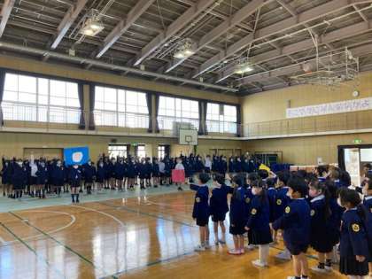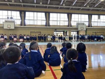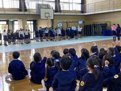 1年生が全校児童と初めて対面し、本格的にすみれ小学校の仲間入りをしました。