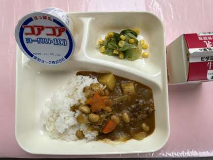 今日の給食は「ごはん、牛肉と大豆のカレーライス、レタスとコーンのサラダ、ヨーグルト、牛乳」です。
