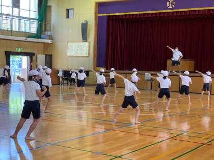 講堂で「ソーラン節」を踊っていました。ソーラン節は、しっかりと腰を低くして、素早い立ち上がりで踊り続けなければなりません。今日の練習では一つ一つの動きを確認しながら丁寧に取り組みました。