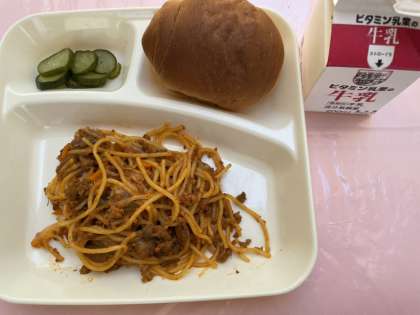 今日の給食は「パン(1/2)・牛乳・スパゲッティミートソース・きゅうりのピクルス」です。