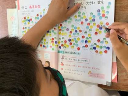 子どもたちは、100より大きい数のかぞえ方を考えました。1年生の時に学習した、「10のまとまり」をつくる方法を思い出し、たくさんあるビー玉の絵を10のまとまりにしました。考えを発表する場面では、ほとんどの子どもたちが「100、10、1のまとまりをつくってかぞえる」という意見でした。かぞえやすい方法をよく理解して、学習のまとめをすることができました。