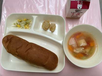 本日の給食献立は、黒糖コッペパン・牛乳・いかてんぷら・フレッシュトマトのスープ煮・サワーソテーでした。
