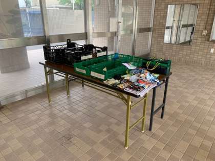 個人懇談会の期間中、玄関ピロティーに1学期の落とし物を並べています。