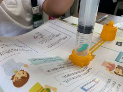 実験では、注射器のピストンを押してシリンダーのめもりを読み取りました。また、注射器の中に入れたスポンジが縮んでいくことに気付いた子どもたちもいました。