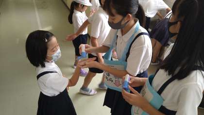 保健委員会の子どもたちが中心となって、放送朝会や給食時の放送、ポスターの掲示等で正しい手洗いの実践を呼びかけています。