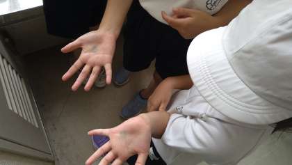 今日は、保健委員会の子どもたちが1・2年生の1組の子どもたちに、手洗い場で「おててポンスタンプ」を掌に押しました。