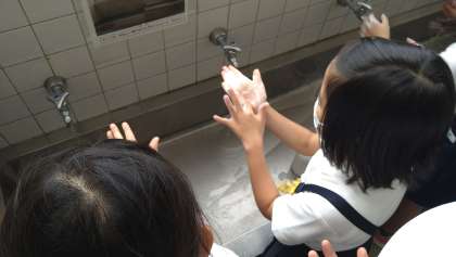 スタンプを押してもらった子どもたちは、きれいに消えるまで丁寧に手洗いを行い、手あらいチェックカードに記入して振り返りをしました。