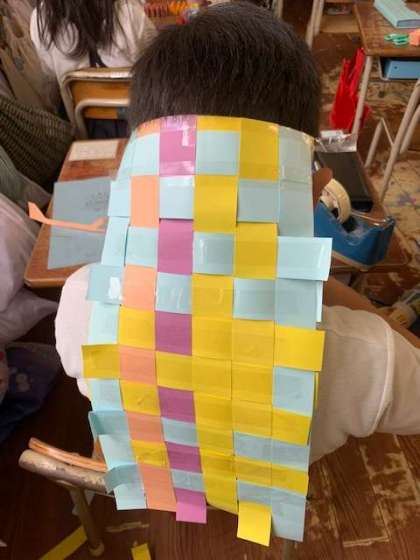1年生は図画工作科の学習で画用紙を自由自在に切って、身につけるもの(かんむり、めがね、ぼうしなど)を制作しています。