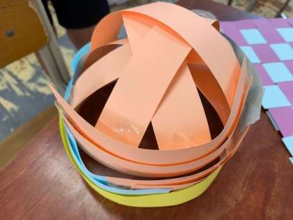 短冊状に細く切った画用紙を編んで、ぼうしやかんむりの飾りにしたり、リング状にした画用紙をつなげていき、くびかざりにしたりしました。そして、作品を見せ合ったり、着付けを手伝ったりして、みんな楽しそうに変身していました。