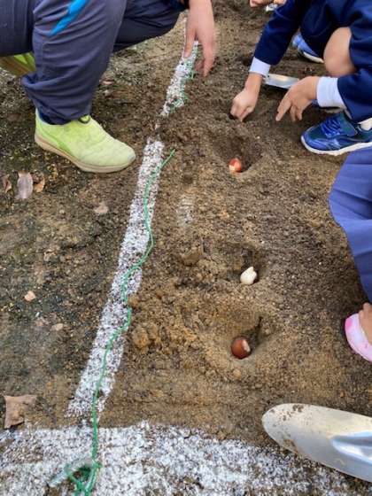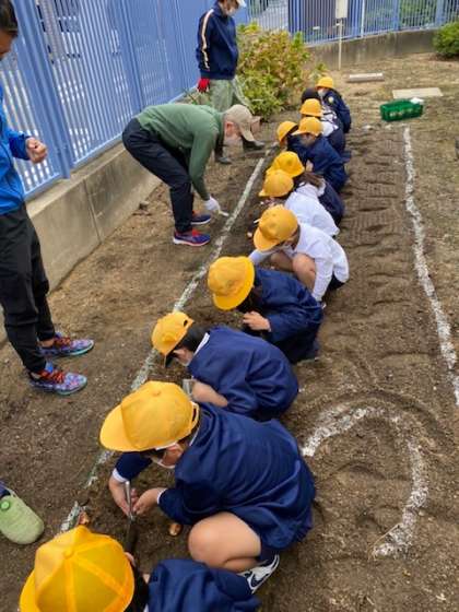 10月27日(水)に、1年生の子どもたちがチューリップの球根を植えました。場所は校門から入って左側の花壇です。紐に沿ったところに合わせて、間隔に注意しながら球根を植えていきました。大変丁寧な作業ぶりに感心しました。