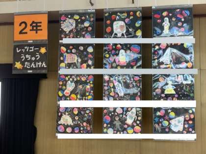 写真は上から、1年「ふしぎなぼうし」、2年「レッツゴー うちゅうたんけん」