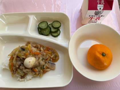 本日の給食の献立は、中華丼・きゅうりの中華あえ・みかん・牛乳でした。