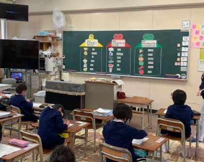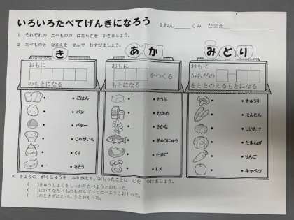 指導内容は「たべものを3つのグループにわけよう」でした。子どもたちは熱心に授業に取り組み、食べものは体の中での働きによって、黄・赤・緑の3つに分けられることを知りました。また、どんな働きがあるかを考え、それぞれのグループにはどんな食べ物があるかを学びました。