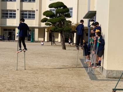 本日の休憩時間の様子です。運動場でボール遊びや鬼ごっこをする子、鉄棒やなわ跳びの練習をする子、竹馬やドッジビーをして遊ぶ子など、朝とは打って変わって暖かくなった休憩時間を思い思いに過ごしていました。