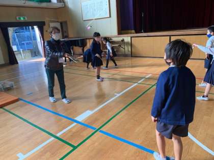 本日の2・3時間目に2年生がすみれ地域の方々と、伝承あそびをしました。17名の地域の方々にお越しいただき、子どもたちに昔あそびを教えてくださいました。