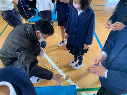 子どもたちの中には、初めて体験した遊びと出会った子、詳しい遊び方がわからないので困っていた子もいました。でも、地域の方々から親切に教えていただき、いっしょに遊んでくださったので、子どもたちは安心して楽しそうに活動していました。普段ゲームをすることが多い子どもたちにとっても、昔あそびは新鮮で楽しかったようです。遊んでいる時の表情がとっても輝いていて、いきいきとしていました。