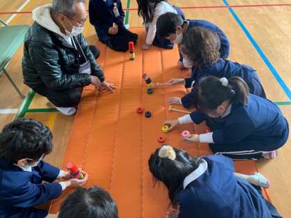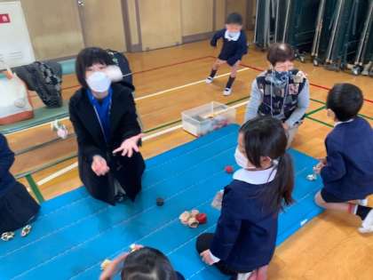 写真は上から、「だるまおとし」「おてだま」の様子です。