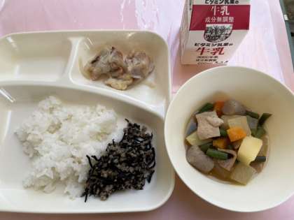 本日の給食は「鶏肉のゆず塩焼き、含め煮、魚ひじきそぼろ、ごはん、牛乳」でした。
