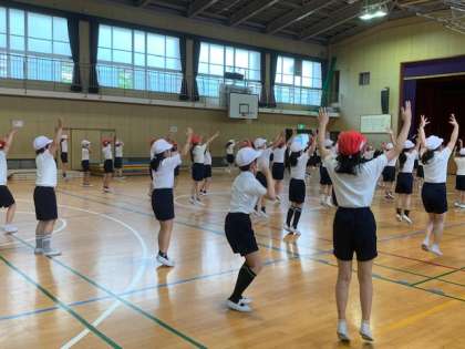 雨天のため体育館での練習でしたが、子どもたちは元気よく表現運動に取り組んでいます。両腕をしっかりてあげ、高いジャンプを披露しながら踊っていました。