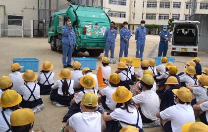 まず、ごみの収集の仕方やパッカー車の仕組みなどについて教えていただいた後、ごみ分別の説明や、収集車が流しているオルゴールの曲についてのクイズを行いました。聞いたことがある曲に子どもたちはすばやく反応して、多くの子どもたちが挙手をして答えていました。