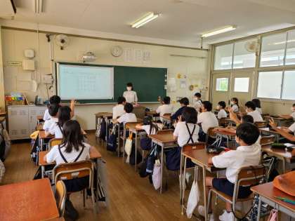 最初、子どもたちは緊張した面持ちで授業に参加していましたが、熱心に説明を聞いたり、積極的に発表したりして学習に取り組んでいました。少し中学生になった気分を味わうことができたようです。