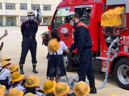 さらに、消防自動車が火事の現場で放水を行う場面も実演してくださいました。一つ一つの動作を確認しながら、ホースの装着から放水までの一連の動作をきびきびと行う姿に、子どもたちは魅了されました。また、今日のように気温の高い日でも、防火衣を着用して消火に当たると聞いて、子どもたちは大変驚いていました。