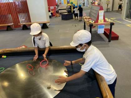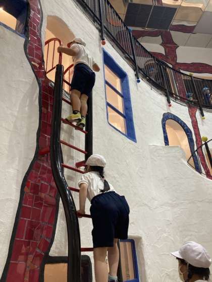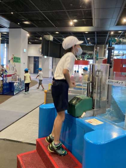行き帰りは天気が良くて暑かったのですが、キッズプラザは屋内なので快適に活動することができました。子どもたちはキッズマートでの買い物体験、科学遊びのコーナーでの実験、こどもの街でかべ登り体験などの活動を楽しみました。そして、おうちの方に作ってもらったお弁当もおいしそうに食べていました。
