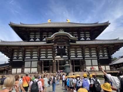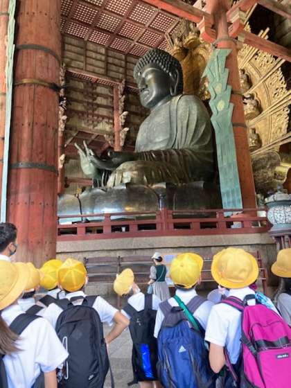 東大寺の大仏を見学したとき、子どもたちは「何メートルあるの?」「手のひらに何人乗れるのかな?」と、大仏の大きさに圧倒されていました。