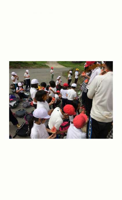ようやく飯ごうすいさんの片付けが終わり、おやつのスイカをいただいています。