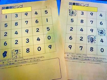 読書に親しむための取り組みとして、図書館ビンゴを行なっています。ビンゴカードには本の分類番号(0から9)が記されており、様々なジャンルの本を読んでもらえるようにしています。