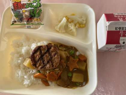本日の給食献立は「ハンバーグカレーライス、カリフラワーのピクルス、豆こんぶ、牛乳」でした。