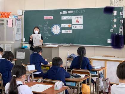 すみれ小学校では、給食・食育の取り組みのうち、栄養教育推進事業を年間指導計画に基づいて、城東区内の栄養教諭の先生が、各学級1回ずつ行っています。